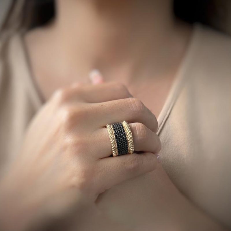 Anel Ca Largo com Zircônia Negra Cravejado banhado em Ouro 18K
