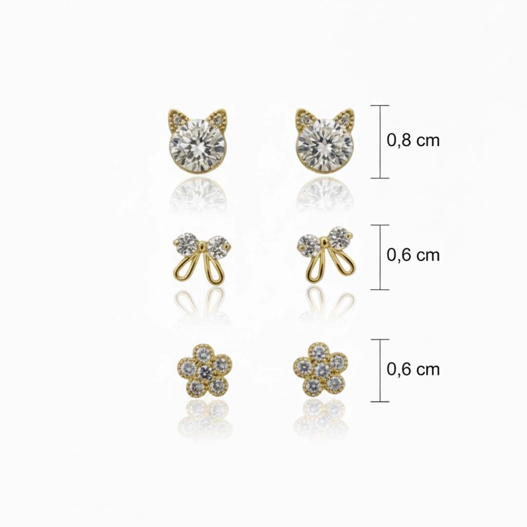 Brinco Trio Flor, Laço Cravejado Banhado em Ouro 18k