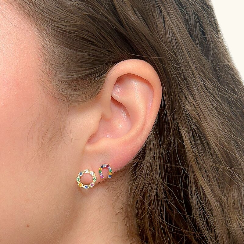 Brinco Duo Redondo Ferradura Cravejado Banhado em Ouro 18k