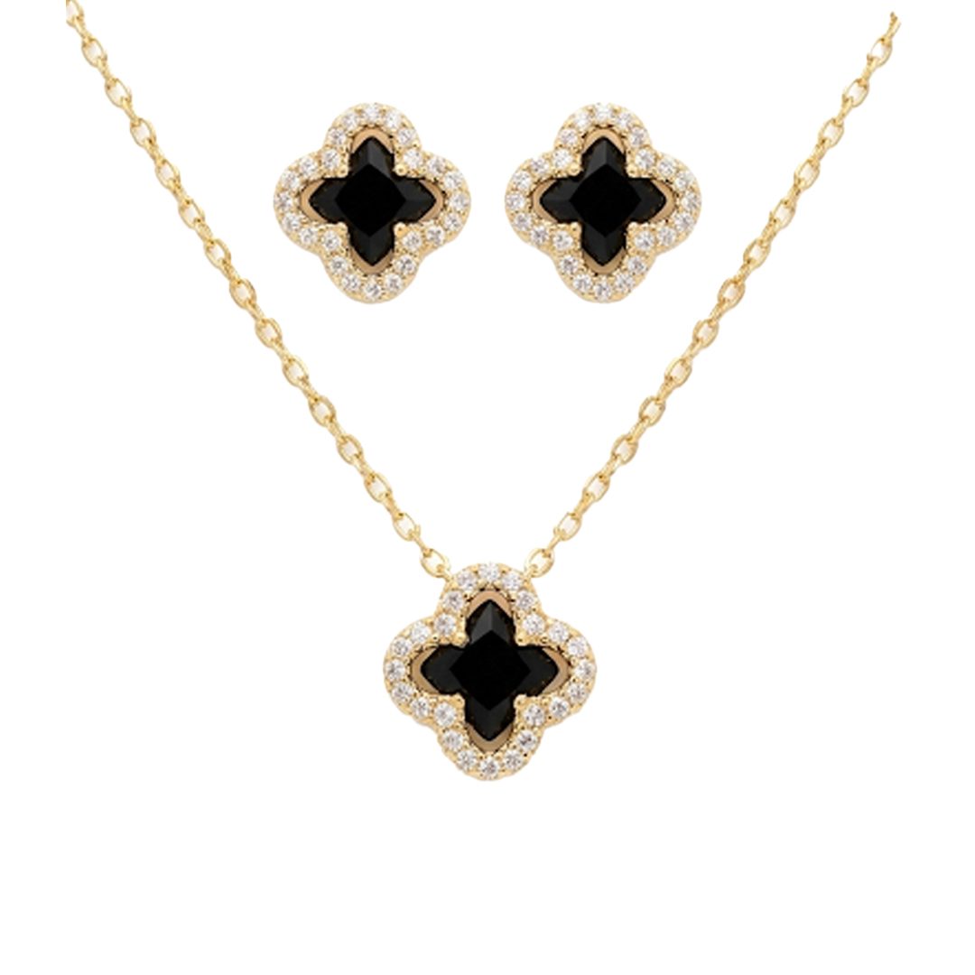 Conjunto Trevo Trabalhado Cravejado Banhado em Ouro 18k