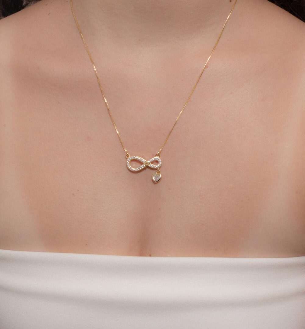 Colar Infinito com Coração Pêndulo Cravejado Banhado em Ouro 18k