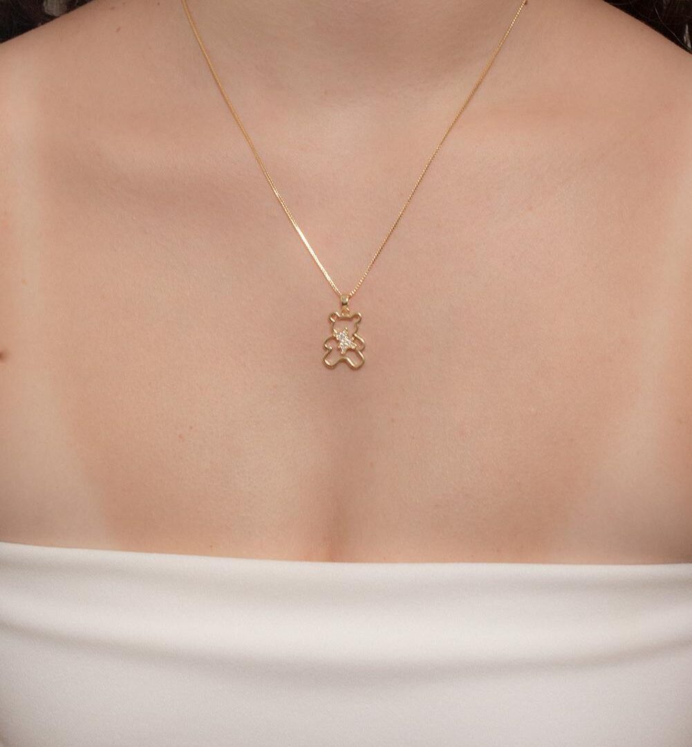 Colar Ursinho Duo Vazado Cravejado Banhado em Ouro 18k