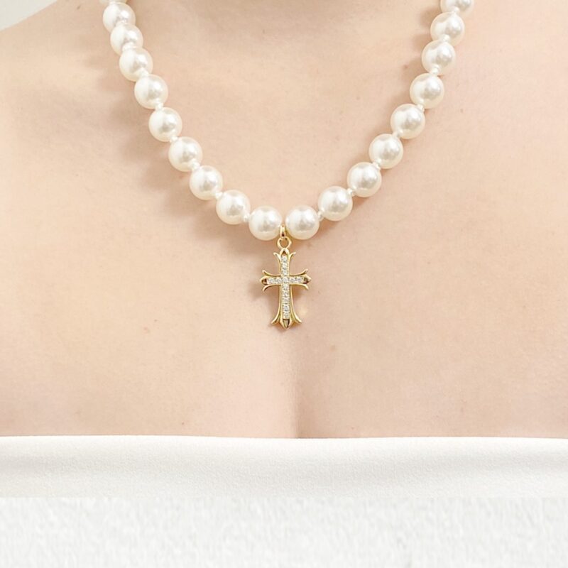 Colar Perola G Crucifixo (50cm) Banhado em Ouro 18