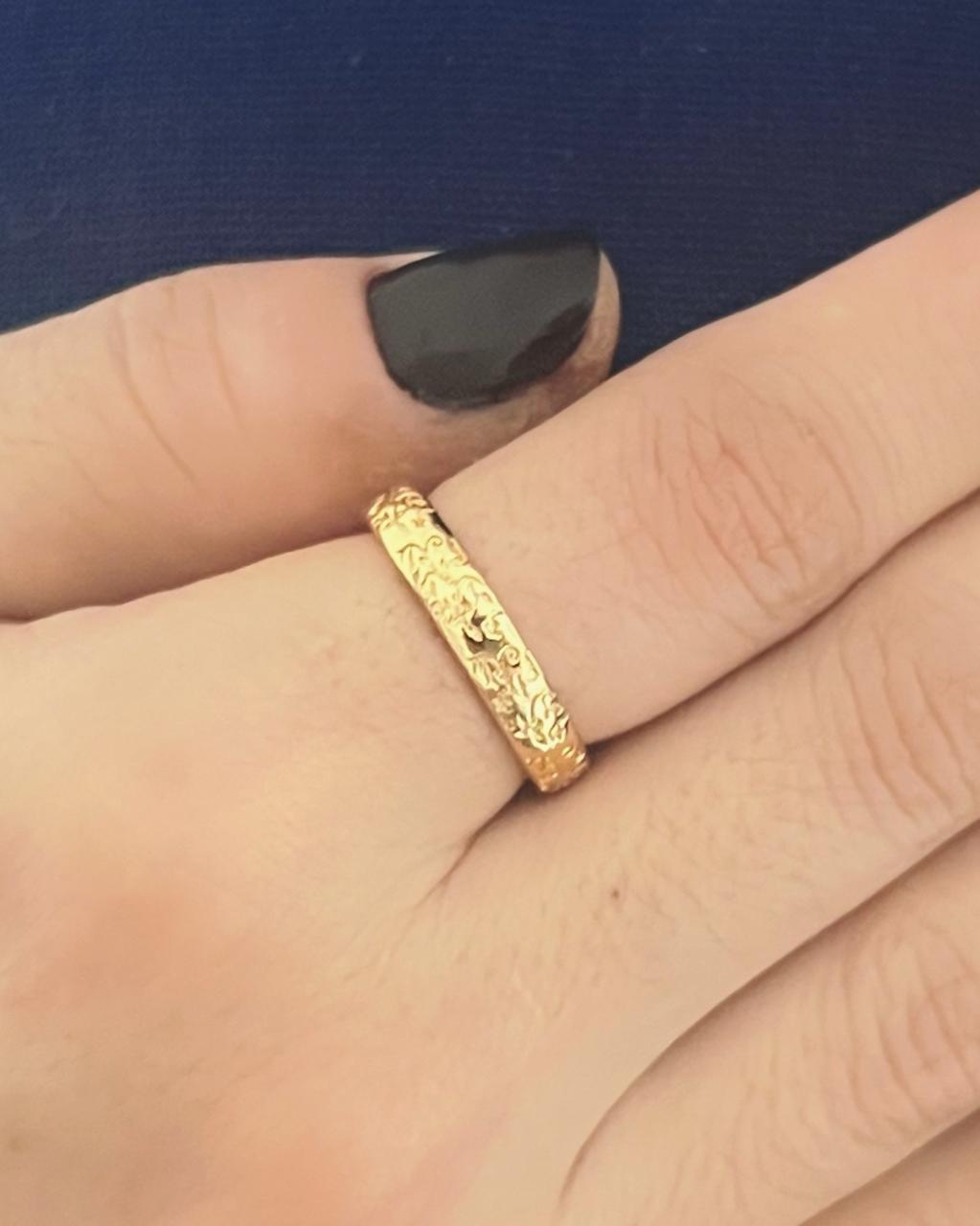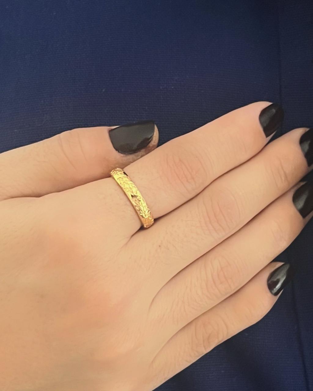 Aliança Trabalhada Banhada em Ouro 18K: Celebre o amor e a união com esta aliança trabalhada, que une tradição e elegância em uma peça única. Banhada em ouro 18K, a aliança exibe um acabamento refinado com detalhes minuciosamente trabalhados, criando um visual sofisticado e atemporal. O design cuidadoso não só destaca o brilho dourado da peça, mas também simboliza a durabilidade e o compromisso de um relacionamento sólido. Ideal para casamentos, noivados ou para renovar votos, esta aliança é um verdadeiro tesouro que será apreciado por toda a vida.
