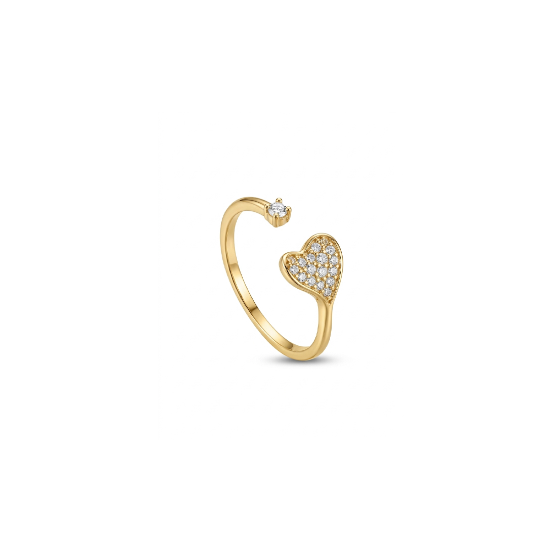 Anel com coração e ponto de luz cravejado, banhado em ouro 18k, com design delicado e ajustável. Ideal para trazer elegância e brilho ao look, com conforto e sofisticação no dia a dia.