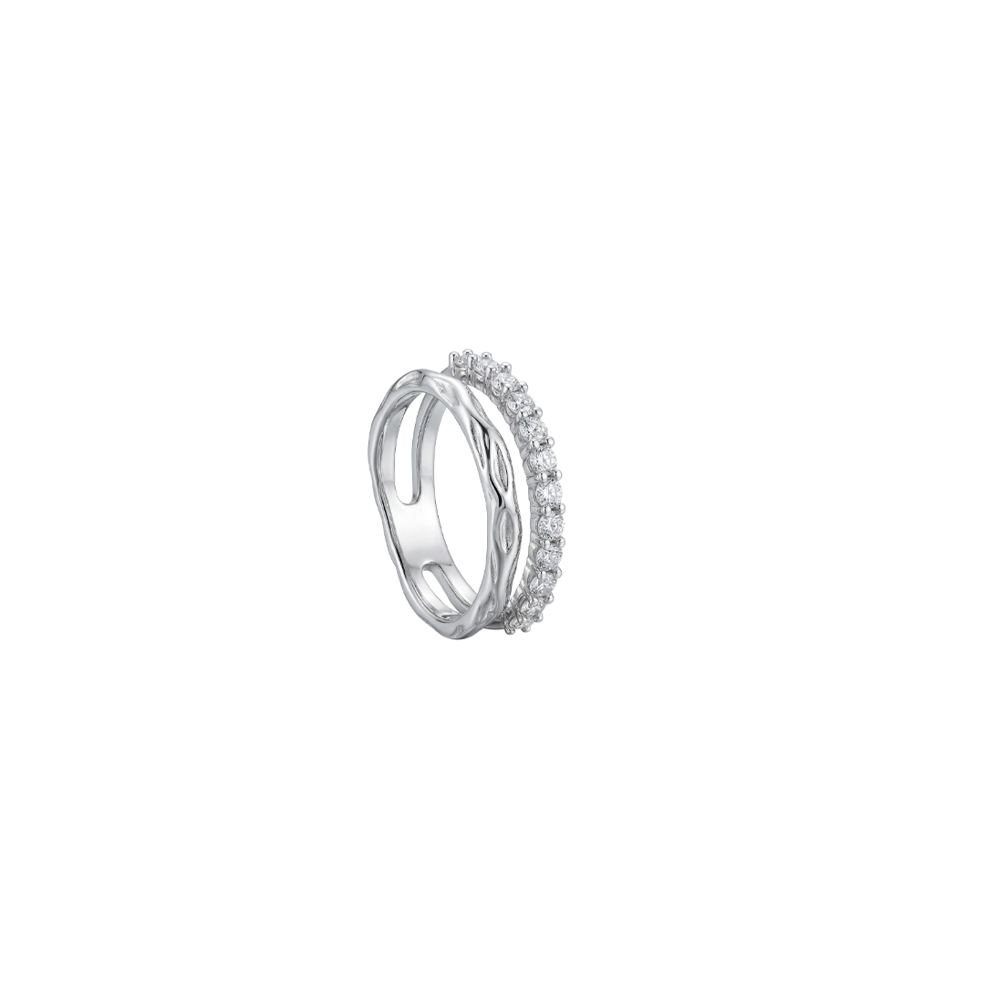 Anel duplo cravejado banhado em ouro 18k, com design moderno e brilho sofisticado. Ideal para compor looks elegantes com presença e estilo no dia a dia ou ocasiões especiais.