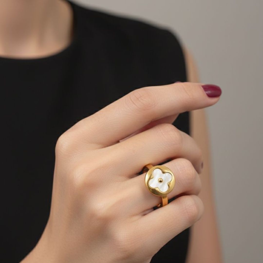 Anel Trevo Madrepérola dourado em aço. Elegância e brilho delicado em um design que simboliza sorte e sofisticação. ✨