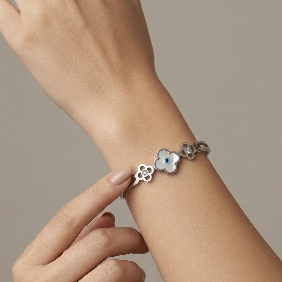Bracelete Trevo Olho Grego em Aço – Este bracelete combina o símbolo da sorte, representado pelo trevo, com o olho grego, conhecido por sua proteção contra energias negativas. Feito em aço de alta qualidade, oferece resistência e durabilidade, tornando-se um acessório ideal para o uso diário.