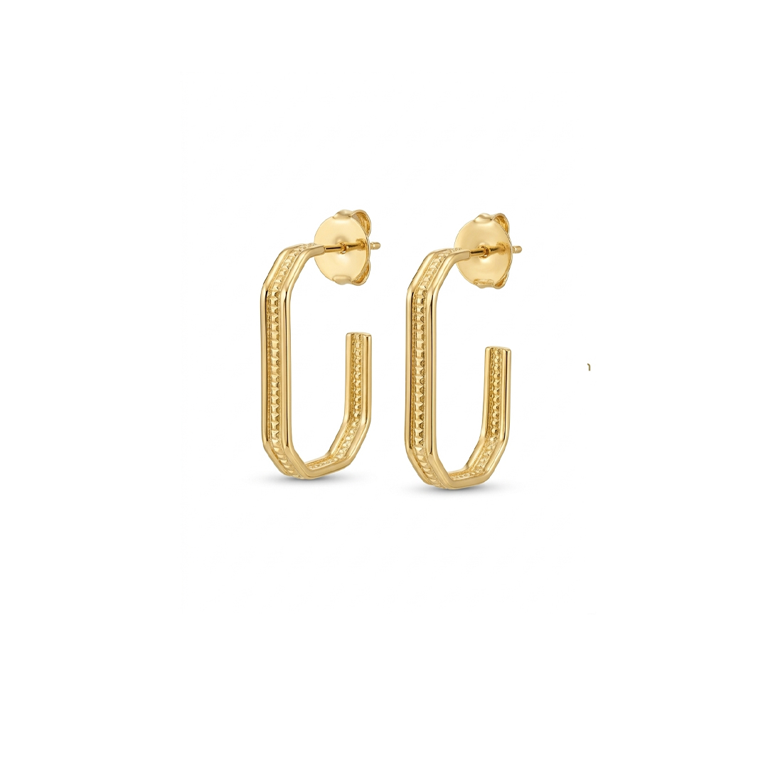 Brinco argola com design geométrico, banhado em ouro 18k, com estilo moderno e acabamento sofisticado. Ideal para compor looks elegantes com um toque contemporâneo e cheio de personalidade.