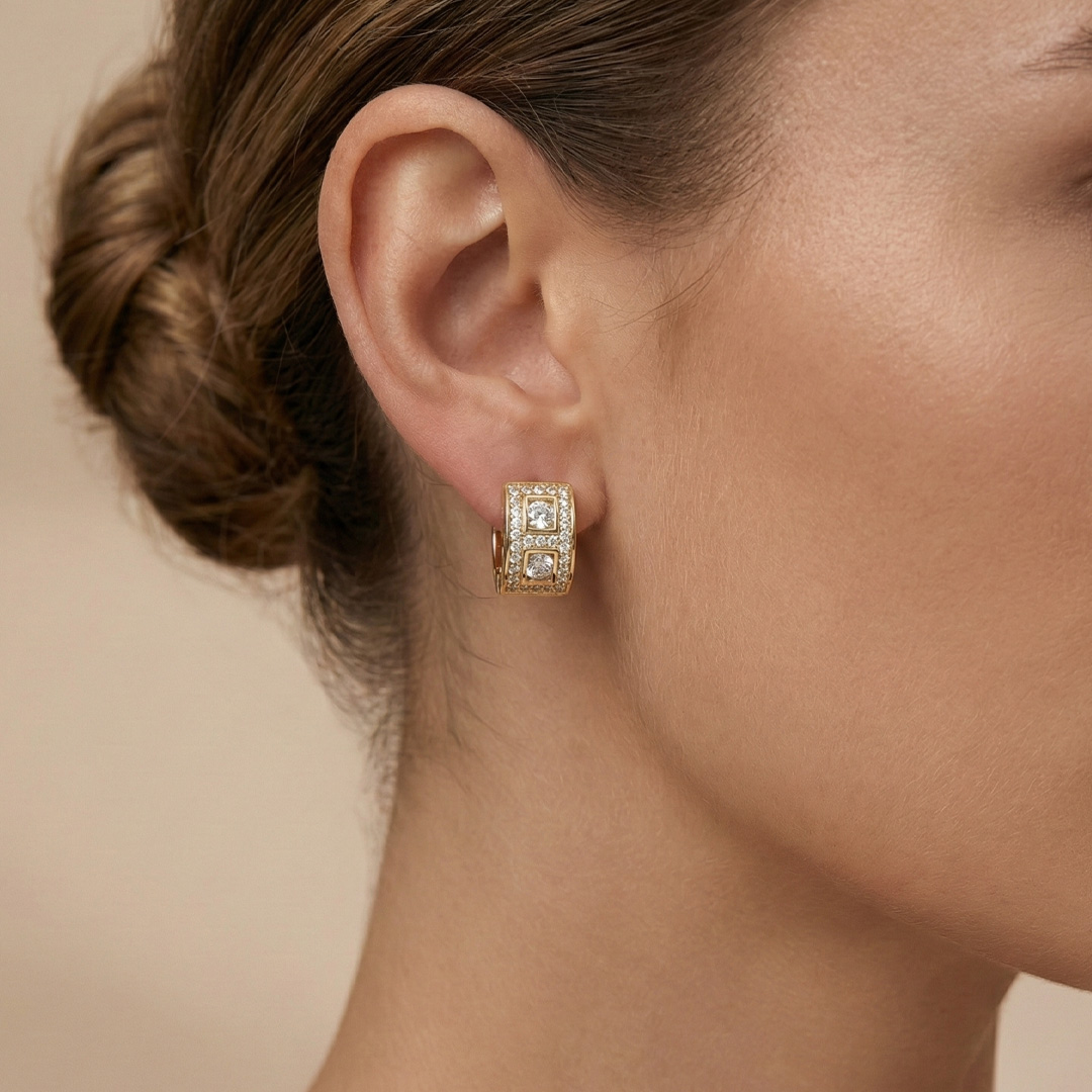 Brinco Argola trabalhado e cravejado com zircônias, banhado em ouro 18k — sofisticação e brilho em um clássico atemporal.