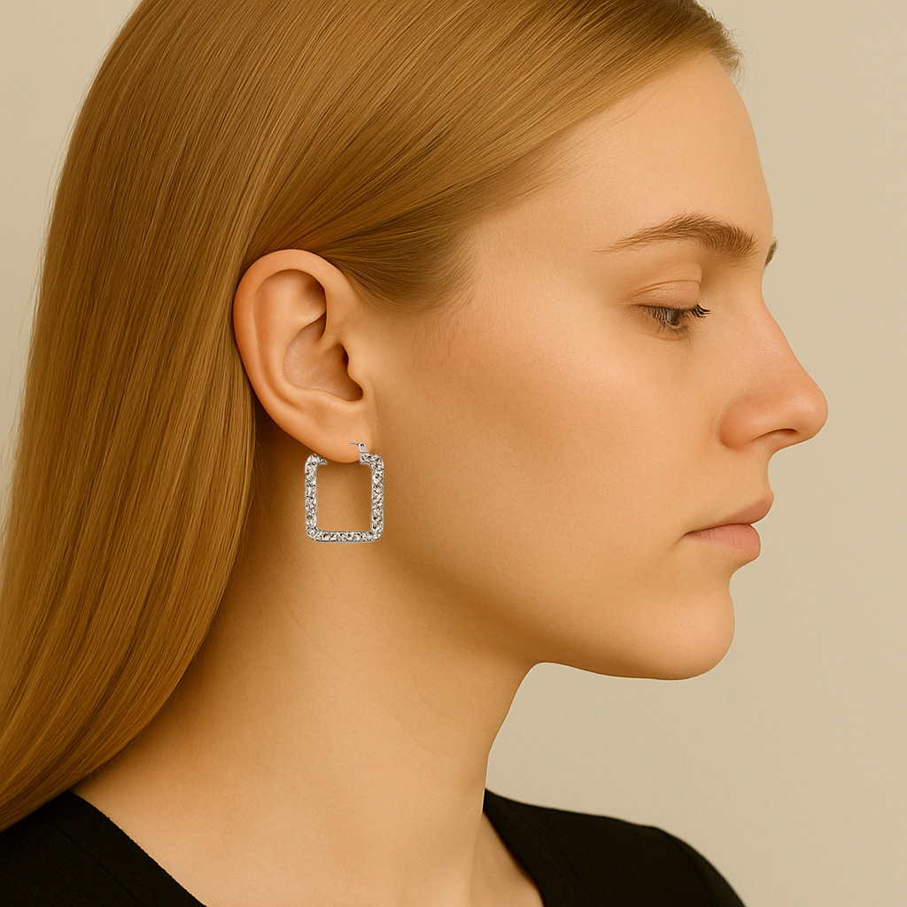 Brinco Click Quadrado trabalhado em aço. Moderno e elegante, com acabamento detalhado e brilho sofisticado. ✨