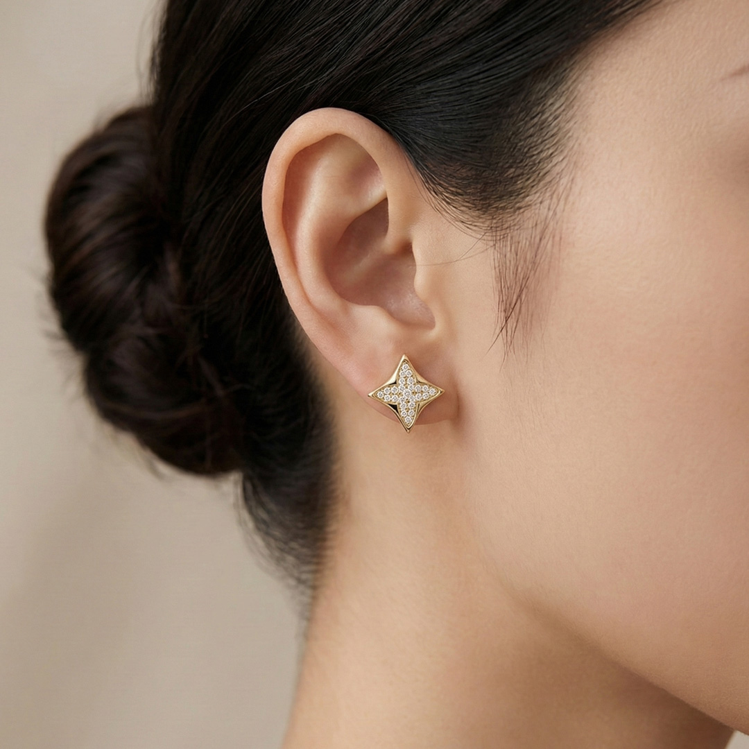 Brinco estrela cravejado banhado em ouro 18k, delicado e elegante, perfeito para iluminar o visual com brilho sutil.