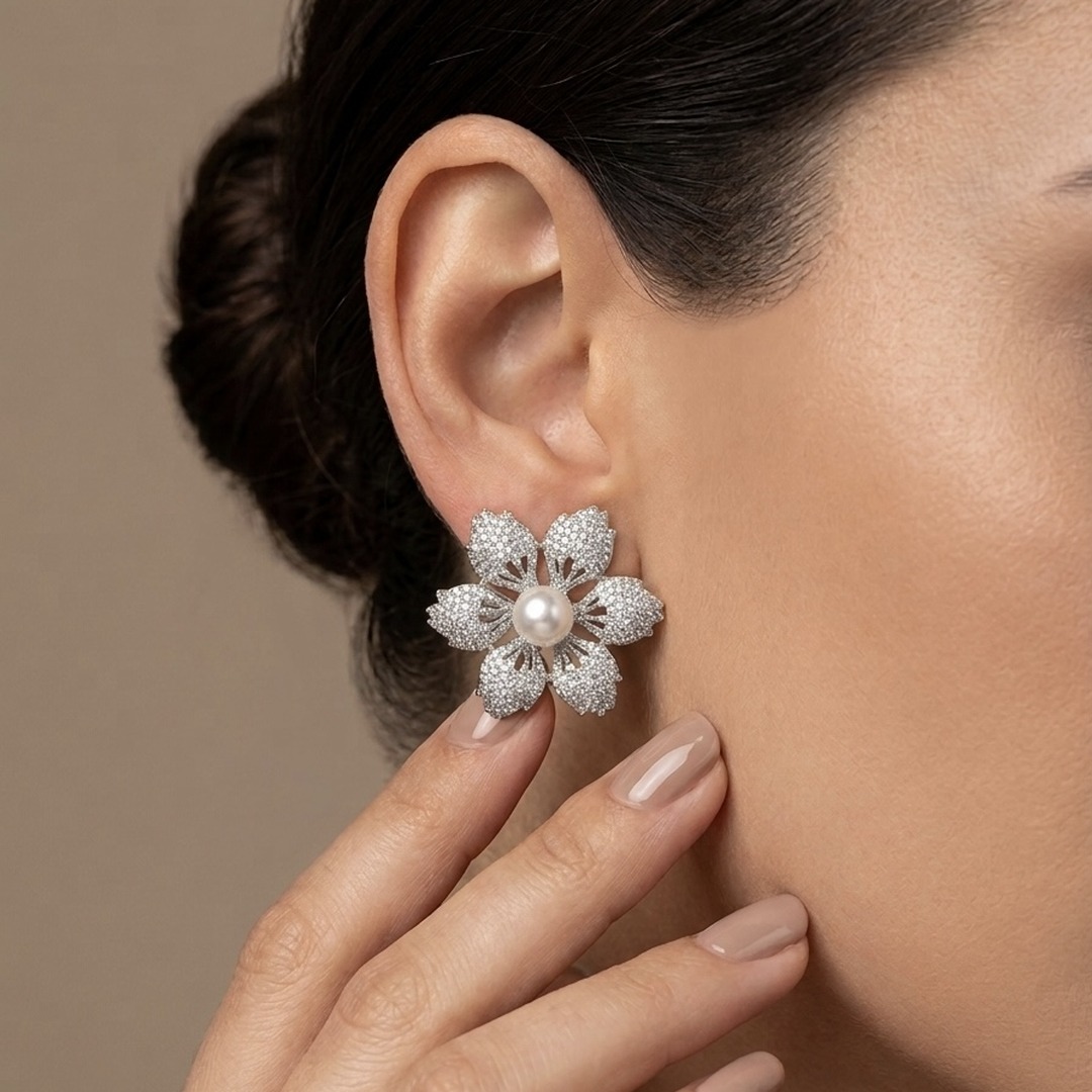 Brinco em formato de flor com pérola e detalhes cravejados, banhado em ouro 18k, com design delicado e brilho sofisticado. Ideal para compor looks elegantes com um toque clássico e feminino.