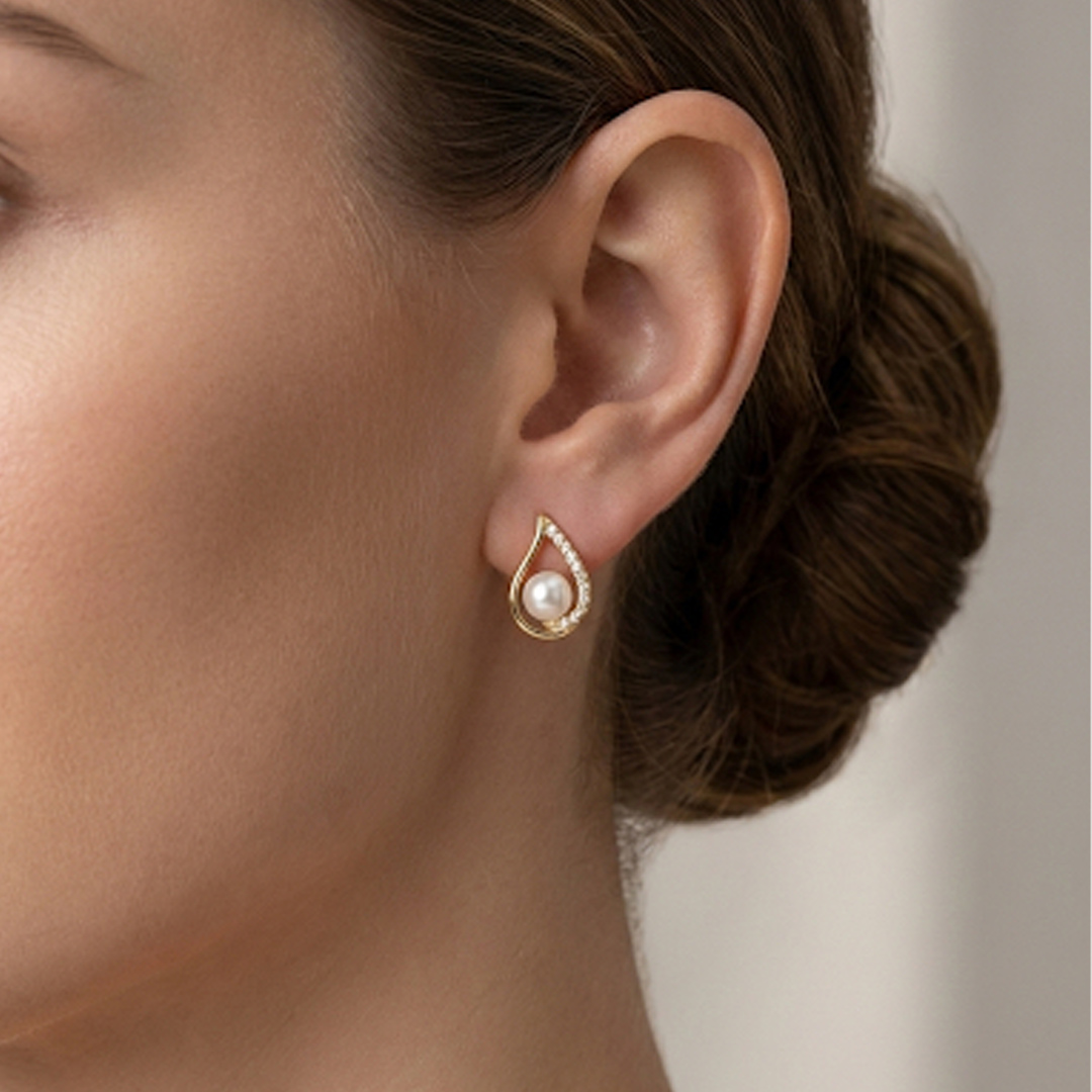 Brinco gota com pérola cravejado banhado em ouro 18K, elegante e sofisticado. Combinação clássica de brilho e delicadeza para valorizar qualquer look.