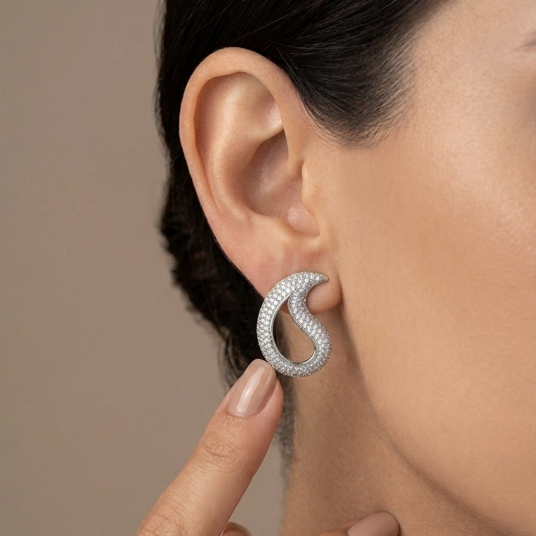 Brinco em formato de gota vazada cravejada, banhado em ouro 18k, com design elegante e brilho sofisticado. Ideal para compor looks refinados com leveza e destaque no dia a dia ou ocasiões especiais.