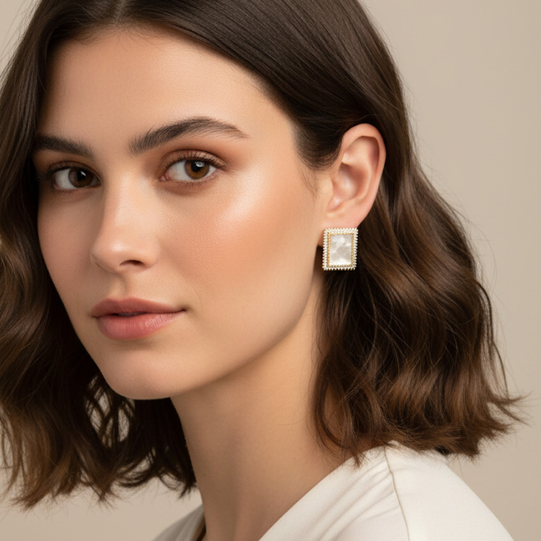 Brinco Quadrado Madrepérola cravejado banhado em ouro 18K. Sofisticado e delicado, com brilho elegante que valoriza seu visual. ✨