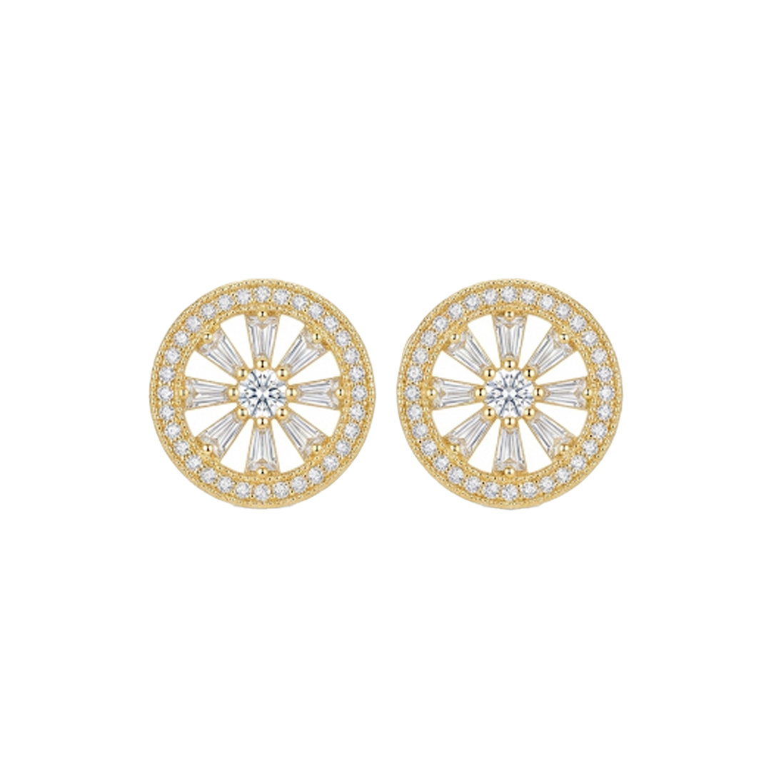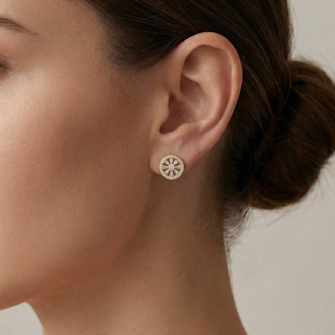 Brinco redondo trabalhado e cravejado, banhado em ouro 18k. Sofisticação e brilho na medida certa para qualquer ocasião.