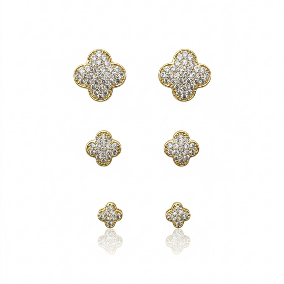 Conjunto de brincos em trio com delicado formato de trevo e microcravação brilhante, banhado em ouro 18k. Elegante e simbólico, representa sorte e sofisticação, permitindo combinações versáteis para uso diário ou ocasiões especiais. Acabamento de alta qualidade, hipoalergênico e ideal para quem busca charme e brilho na medida certa.