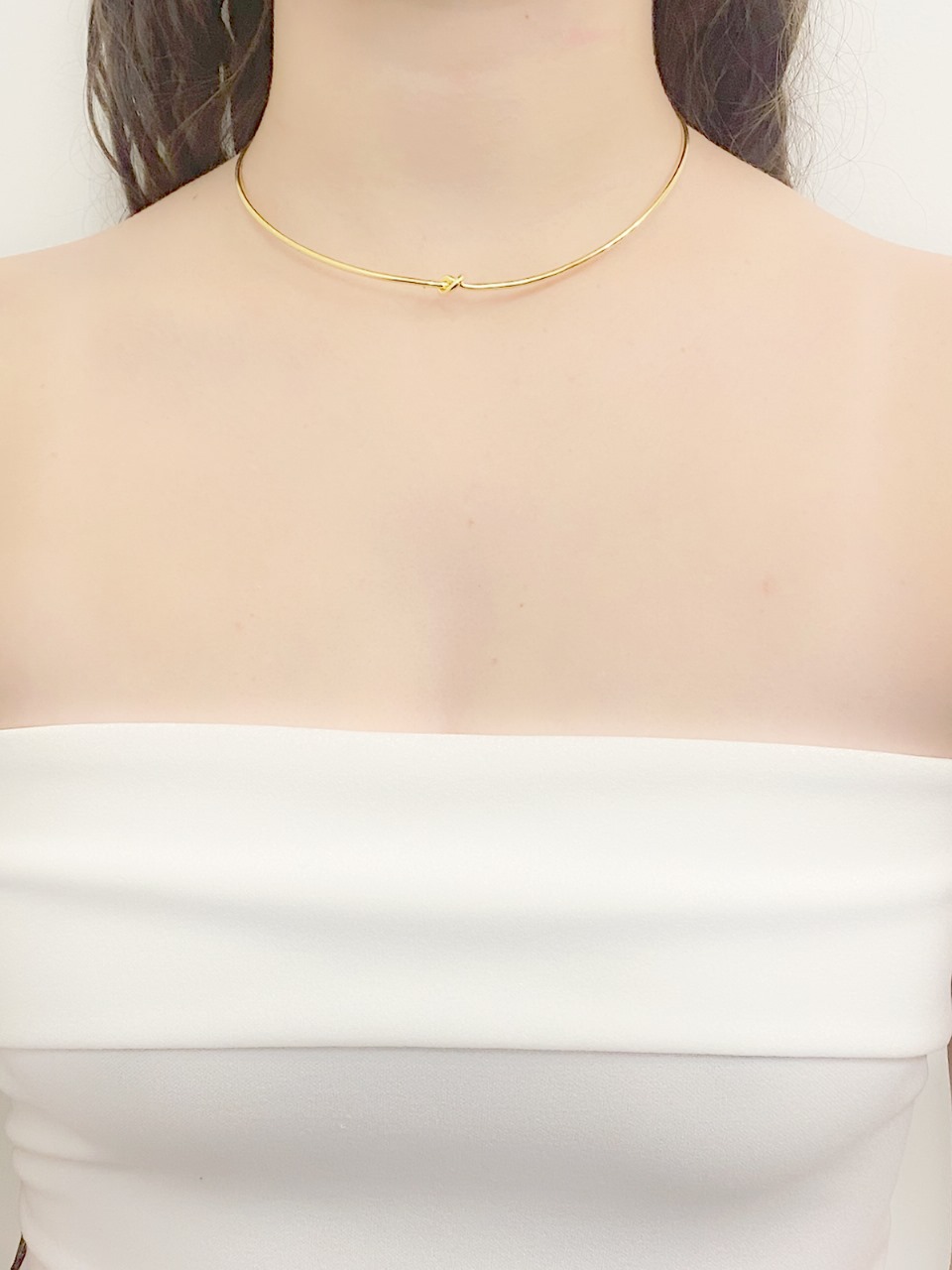O colar apresenta um design único com um aro rígido e limpo, que se encontra em um nó delicadamente esculpido, criando um ponto focal interessante e moderno. Este nó simboliza a união e a complexidade elegante do design. O banho em ouro 18k confere um acabamento luxuoso e um brilho duradouro, realçando a beleza do formato e garantindo que a peça mantenha seu esplendor por muito tempo, além de ser hipoalergênica.