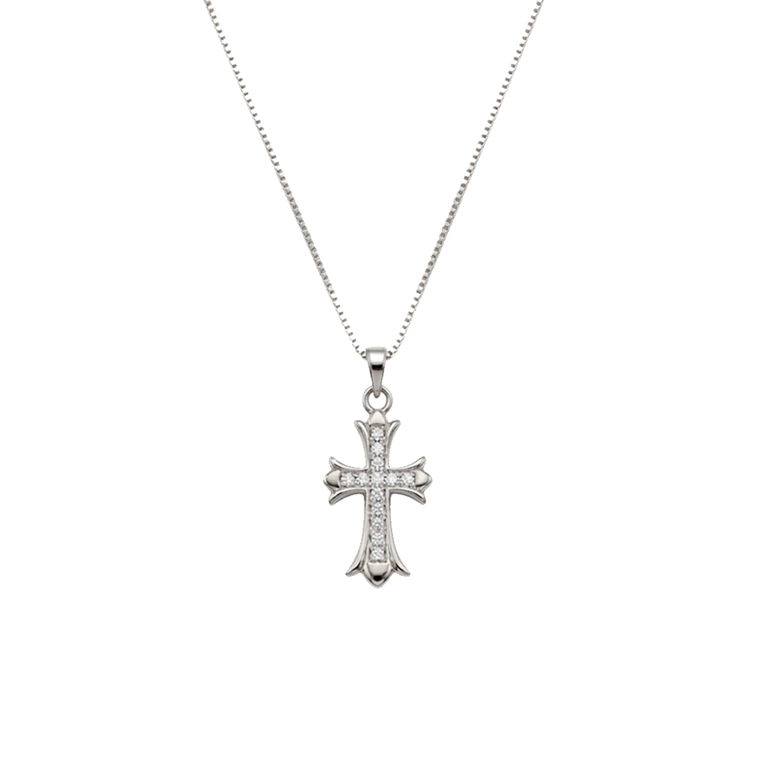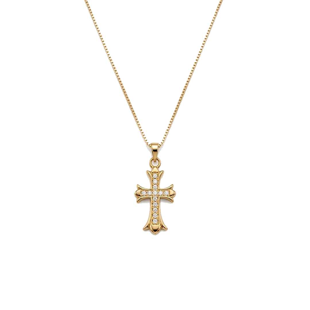 Colar crucifixo cravejado banhado em ouro 18k, com brilho intenso e acabamento sofisticado. Ideal para compor looks elegantes com um toque de fé e estilo no dia a dia.