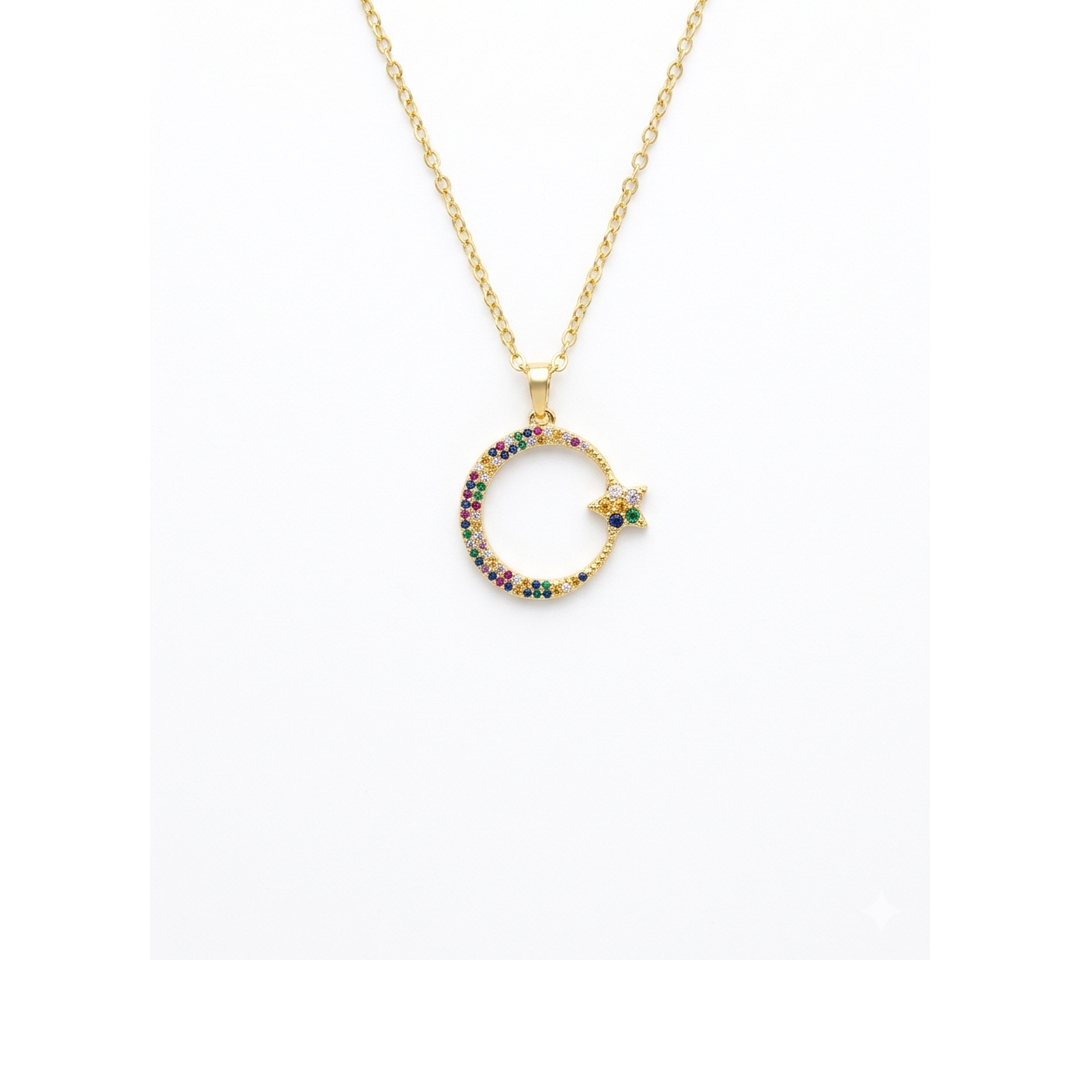 Colar Mandala Lua Estrela Cravejado Banhado em Ouro 18k
