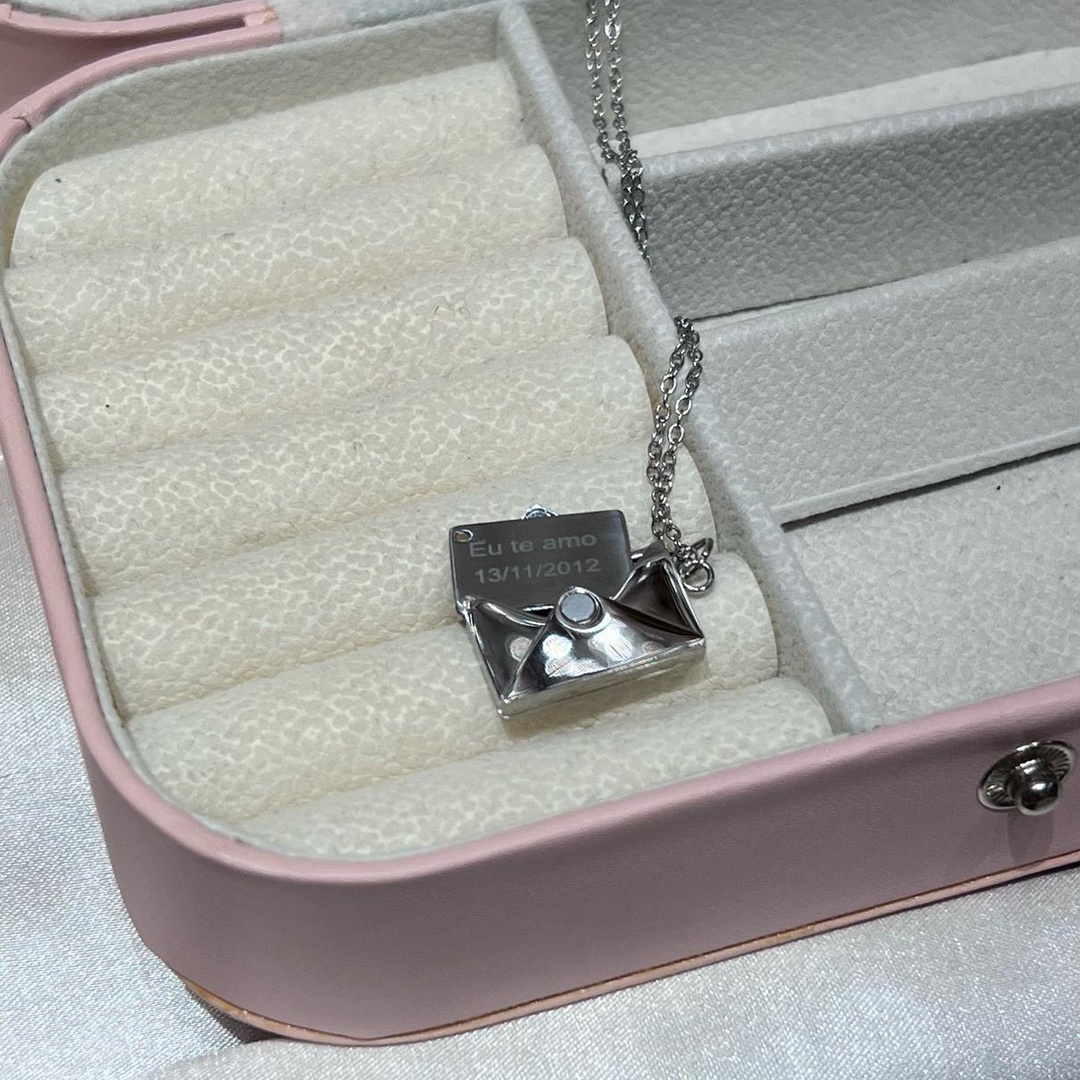 O colar personalizado estilo carta em aço inoxidável é uma joia única e cheia de significado, perfeita para quem deseja expressar sentimentos de forma elegante e original. Com design inspirado em envelope/carta, permite personalização com nome, iniciais ou mensagem especial, tornando cada peça exclusiva.