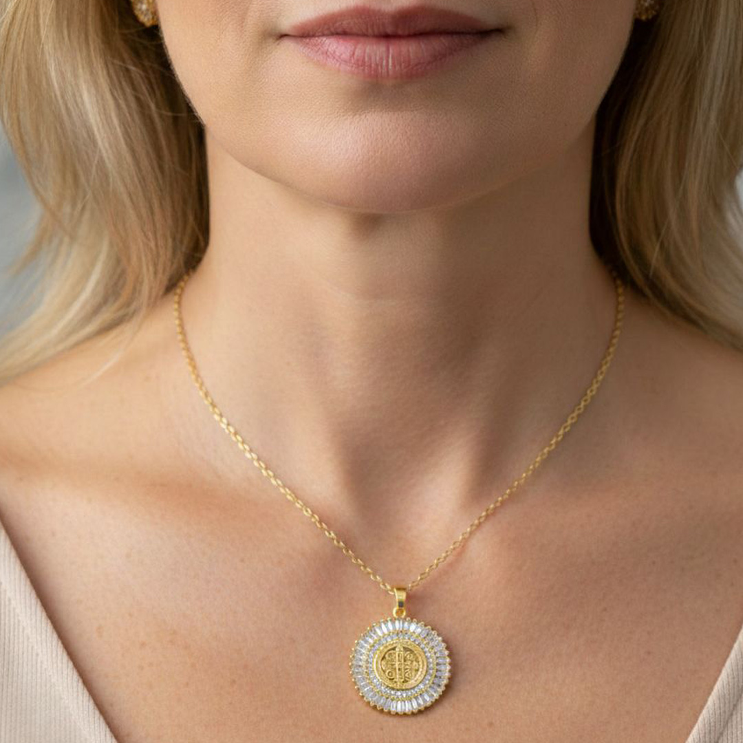 Colar São Bento cravejado banhado em ouro 18k, com brilho sofisticado e forte significado de proteção. Ideal para compor looks elegantes com um toque de fé e estilo no dia a dia.