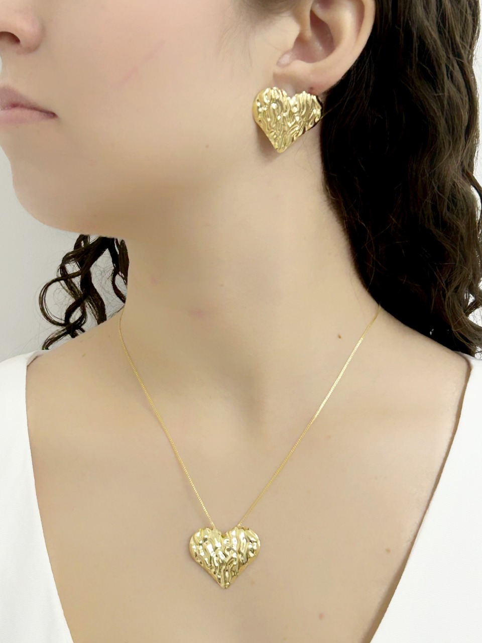 Cada peça apresenta um coração delicadamente trabalhado, com detalhes que conferem textura e um jogo de luz encantador. O banho em ouro 18k garante um acabamento de luxo, resistência e o brilho intenso que só o ouro pode proporcionar, fazendo desta joia um verdadeiro tesouro.