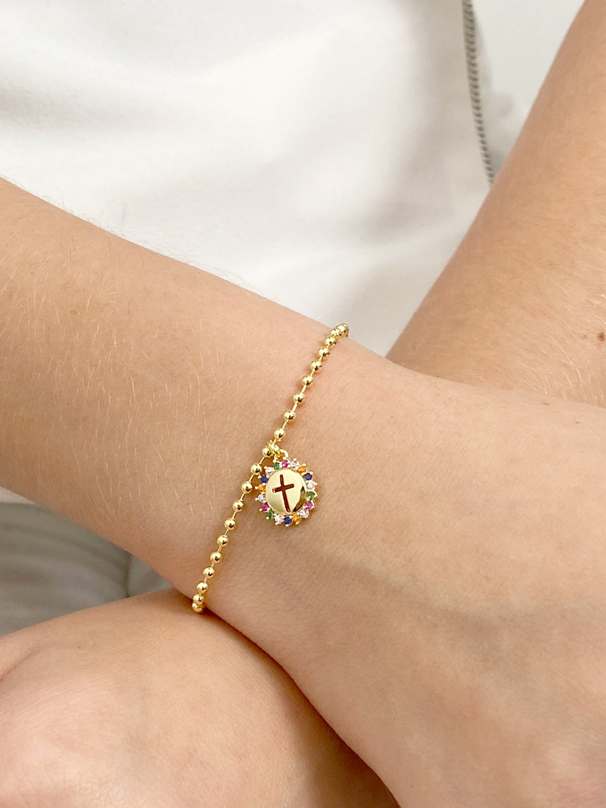 Pulseira Bolinha Bolinha Cruxifixo Cravejado Banhado em Ouro 18k