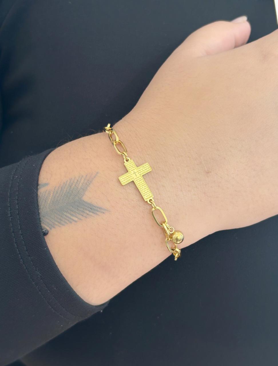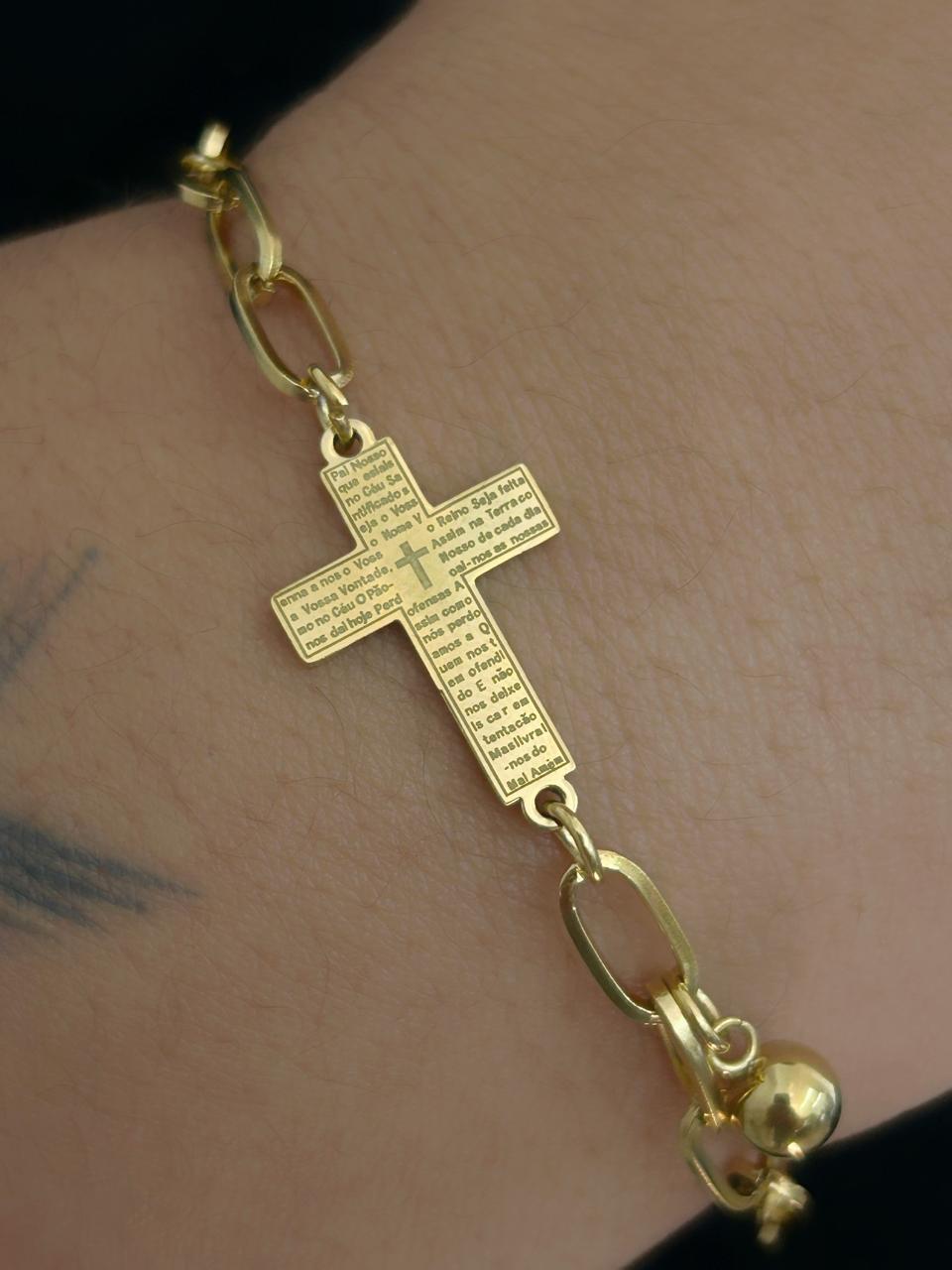 O design da pulseira destaca-se pelos elos robustos que se interligam harmoniosamente, proporcionando um visual elegante e contemporâneo. No centro da peça, um crucifixo detalhado é acompanhado de uma pequena placa gravada com o texto do Pai Nosso, simbolizando proteção e espiritualidade. Este elemento não apenas enriquece o significado da pulseira, mas também serve como um lembrete constante de fé e devoção.