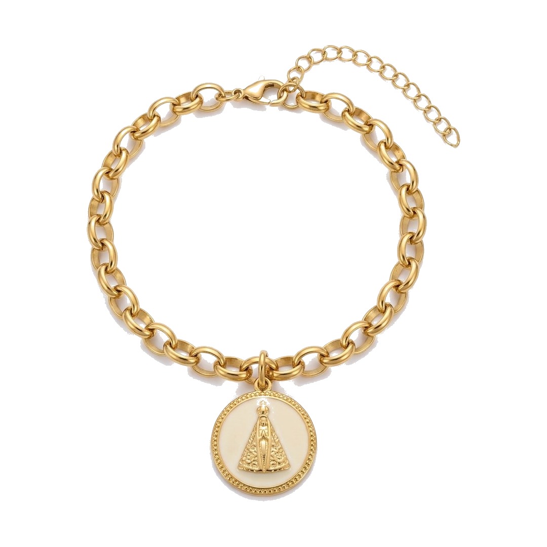 Pulseira elo português com medalha redonda de Nossa Senhora em aço inoxidável, com design clássico e cheio de significado. Ideal para compor looks elegantes com durabilidade e brilho que não escurece no dia a dia.