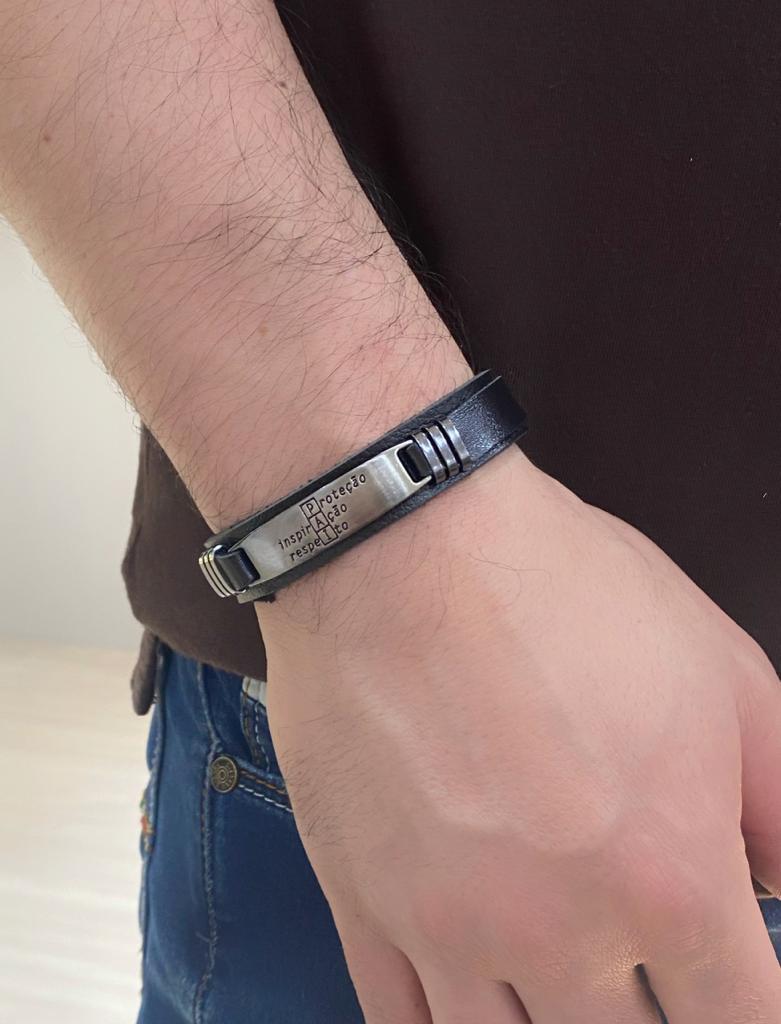 Pulseira em Courino com chapa gravada em aço inoxidável.