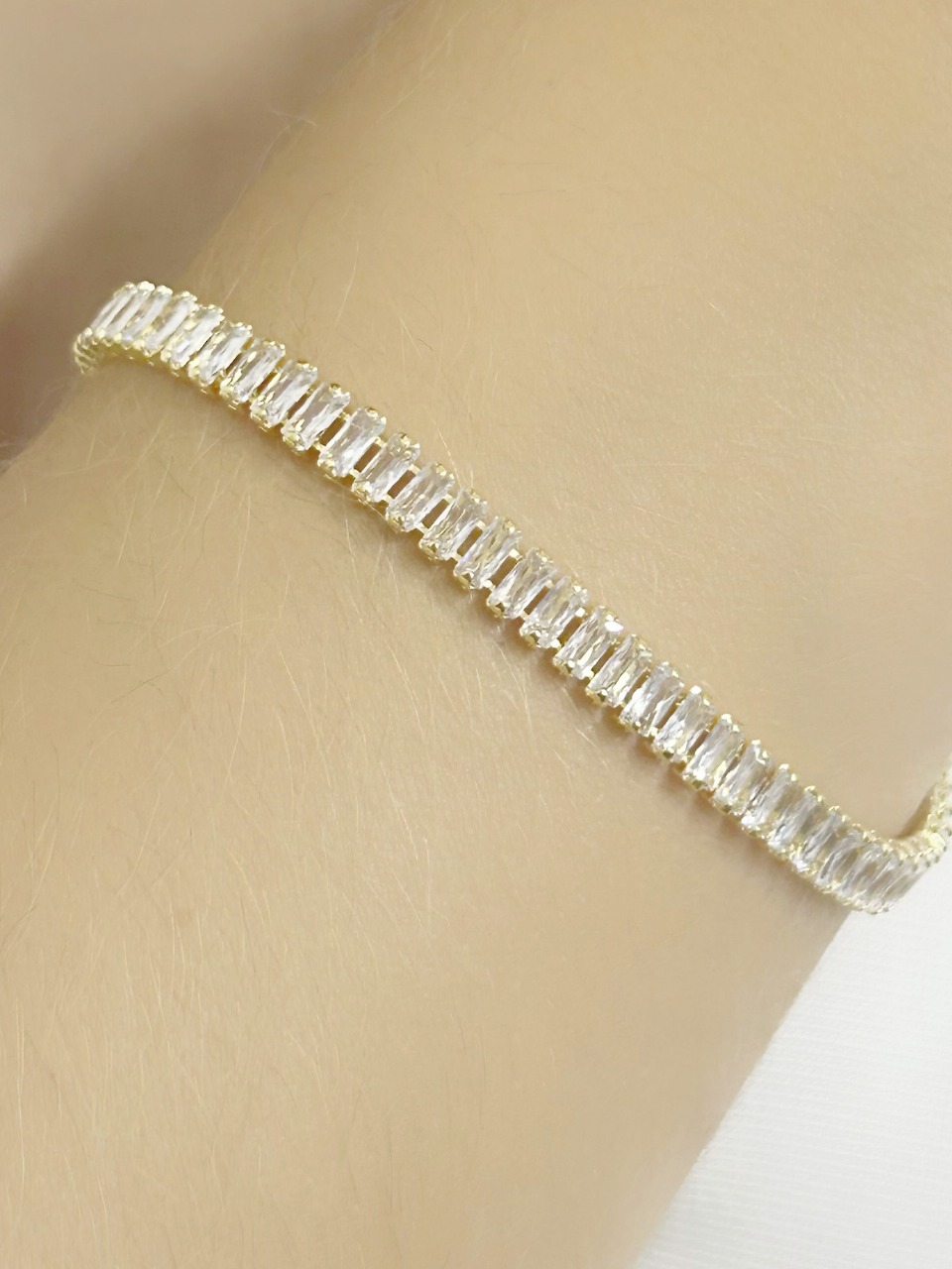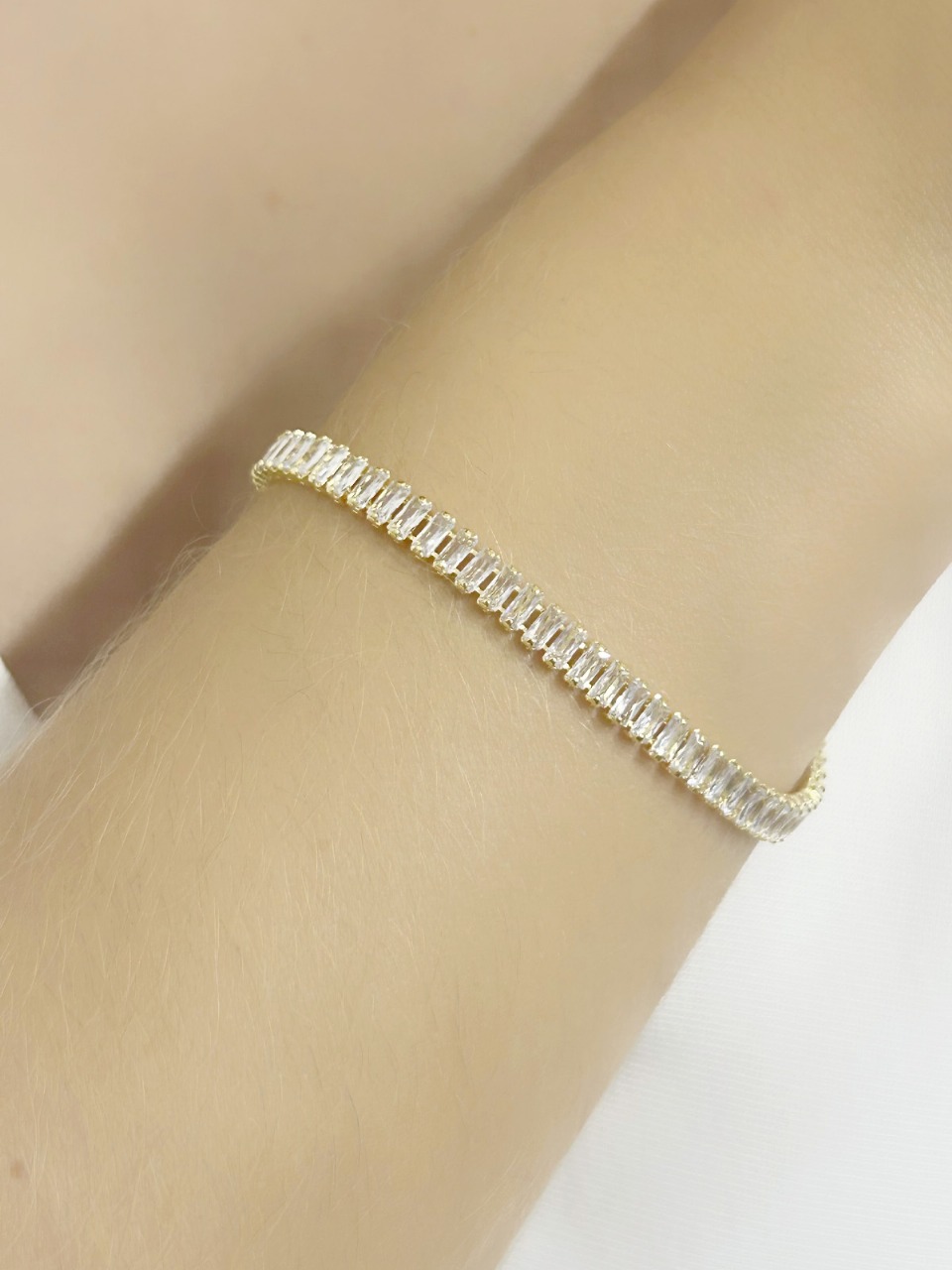 Experimente a sofisticação sem limites com a Pulseira Riviera Cravejado Banhado em Ouro 18k. Esta joia icônica é a essência do glamour, com seu design clássico e atemporal que irradia brilho e elegância em cada centímetro.